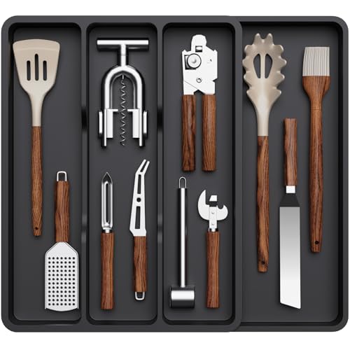 Range Couverts pour Tiroir, Grand Plateau de Couverts Extensible pour la Cuisine, Support Réglable pour l'Argenterie et les Couverts, Range Couvert pour Outils et Gadgets, Grand, Noir
