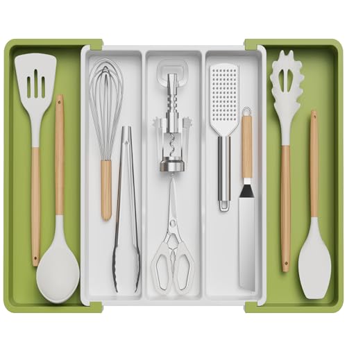 Lifewit Range Couverts pour Tiroir, Grand Plateau de Couverts Extensible pour la Cuisine, Support Réglable pour l'Argenterie et les Couverts, Range Couvert pour Outils et Gadgets, Grand, Vert et Blanc