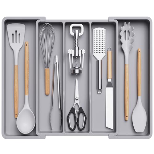 Lifewit Range Couverts pour Tiroir, Grand Plateau de Couverts Extensible pour la Cuisine, Support Réglable pour l'Argenterie et les Couverts, Range Couvert pour Outils et Gadgets, Grand, Gris