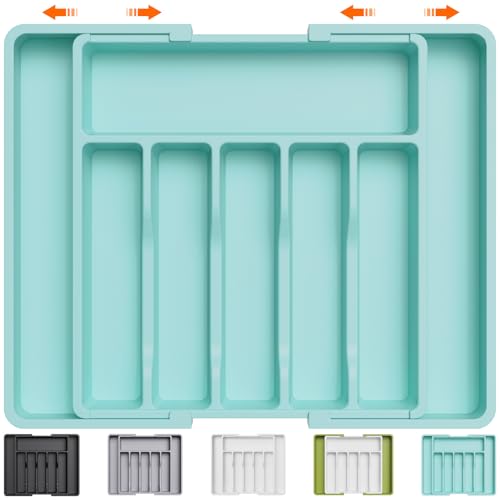 Lifewit Range Couverts pour Tiroir, Plateau d'Ustensiles Extensible, Organisateur de Cuisine Réglable, Rangement Compact pour Contenir des Cuillères, Fourchettes, 33-57 x 38 cm, Lot de 1,Turquoise