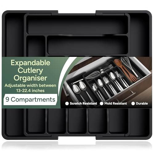 edihome, Range Couverts pour Tiroir, Plateau d'Ustensiles Extensible, Rangement Cuisine, avec 6 à 8 Compartiments, Sans BPA, Ustensiles de Cuisine, Ajustable (Noir)