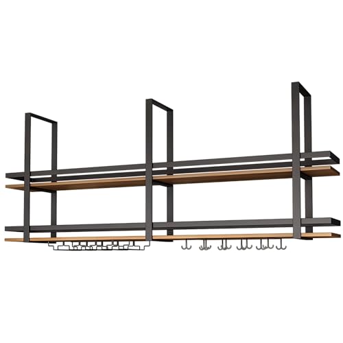Support mural pour verres à vin, étagère de rangement en verre suspendue au plafond, porte-bouteille vin flottant métal et en bois avec supports à verres à pied bar, étagère rangement décorative ( Siz