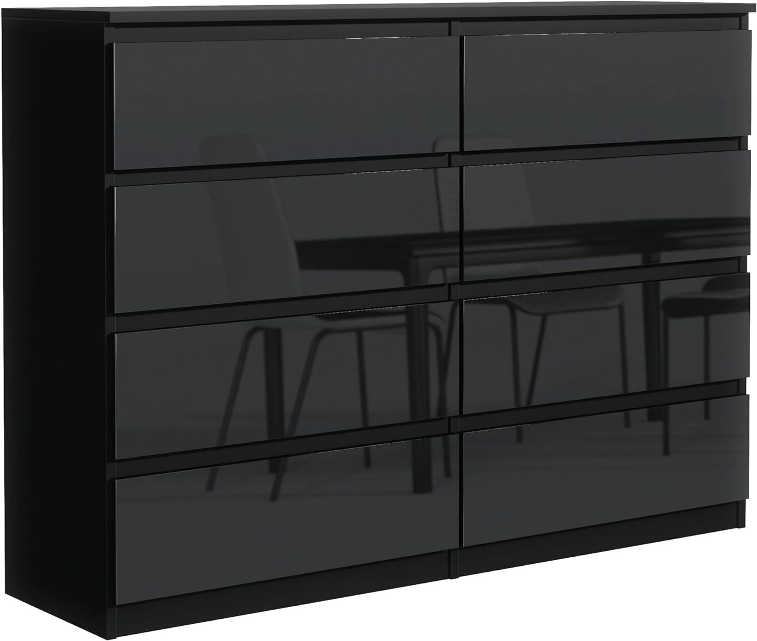 Commode Noir Brillant avec 8 tiroirs 120 cm, Meuble Rangement Chambre Adulte