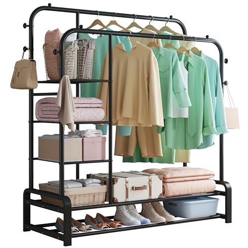 SMILOVII Portant à Vêtements Double avec Étagères et 8 Crochets, Penderie Dressing Métal Solide avec Porte-Manteau, Rangement Chambre et Chaussures, Penderie Adulte Noire