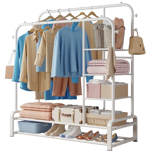 SMILOVII Portant à Vêtements Blanc Double avec Étagères, 8 Crochets, Penderie Dressing Métal Solide avec Porte-Manteau, Rangement Chambre et Chaussures, Penderie Adulte