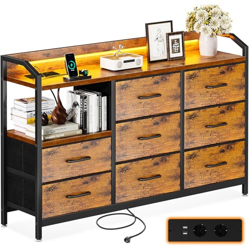 ODK Commode Chambre Adulte, avec Bandes LED Réglables en 10 Couleurs, 2 Prises USB et 2 Prises Secteur, 8 Grands Tiroirs en Tissu, Commode Rangement 110 x 30 x 88 cm, Couleur Vintage
