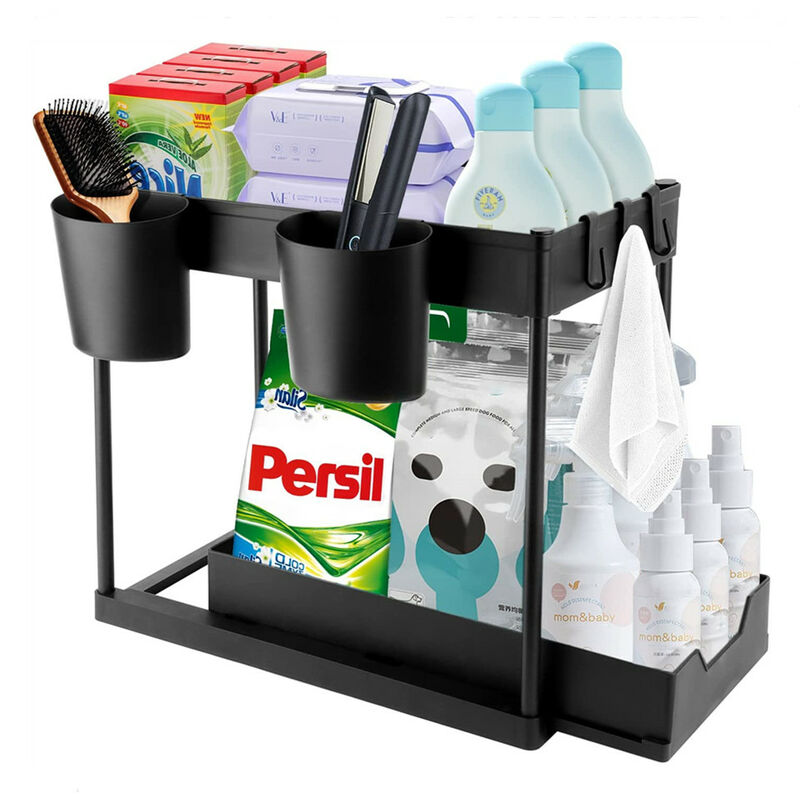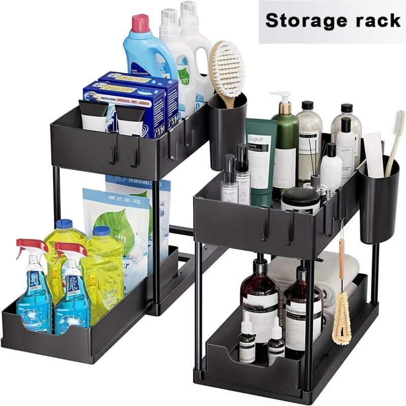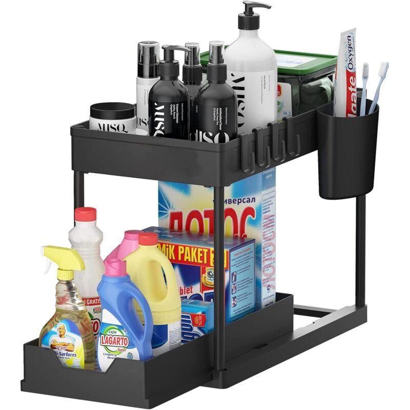 Lot de 2 organisateurs sous évier – Tiroir coulissant pour accès facile – Rangement cuisine et salle de bain – Noir – 8 crochets inclus