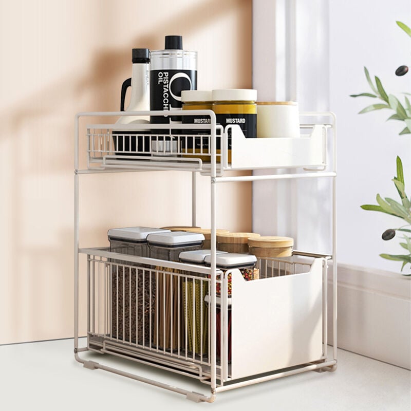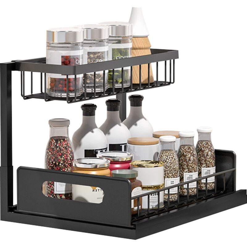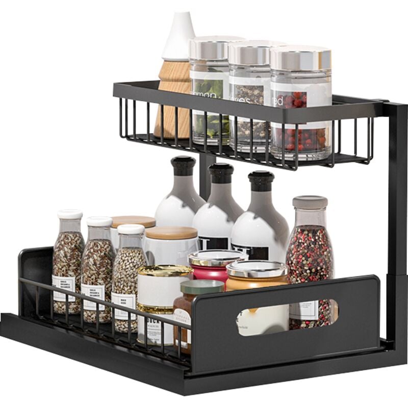 Panier coulissant à 2 niveaux en fer – Organisateur tiroir à épices sous évier – Rangement cuisine résistant à la rouille – Facile à nettoyer – Aqrau
