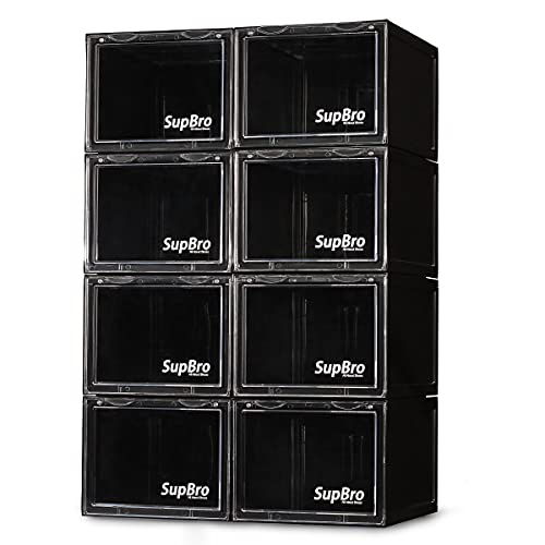 SupBro Collection Crate – Lot de 8 boîtes de rangement à chaussures faciles d'accès – Plastique pliable et empilable pour baskets avec organiseur de porte avant transparent (noir)