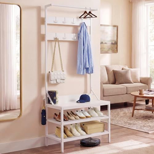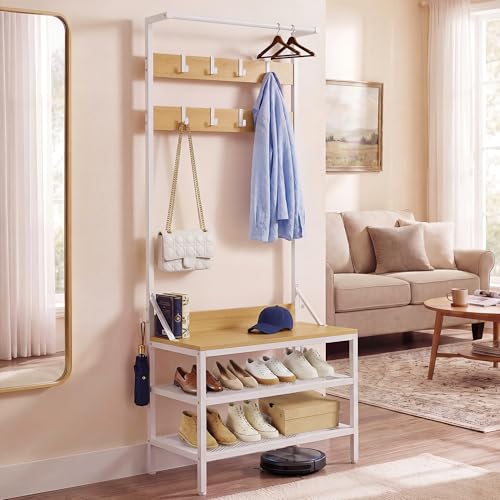 YITAHOME Porte-manteau industriel avec rangement de chaussures, 2 étagères, porte-manteau industriel avec 9 crochets, pour couloir, salon, chambre à coucher, cadre en métal, blanc