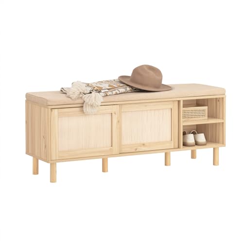 SoBuy Banc Chaussures Entrée Meuble Chaussures Banc de Rangement Chaussures Banc de Rangement avec Coussin Rembourré, Étagères et 2 Portes Coulissantes, 121x35x49 cm, FSR163-N