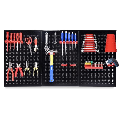 SOARS Mur à Outils 120 X 60 CM en Métal, Rangement des Outils avec Kit de 17 Crochets, Porte-Outils Mural en 3 Panneaux Perforés de Haute Qualité, pour Garage, Atelier, Noir et Rouge