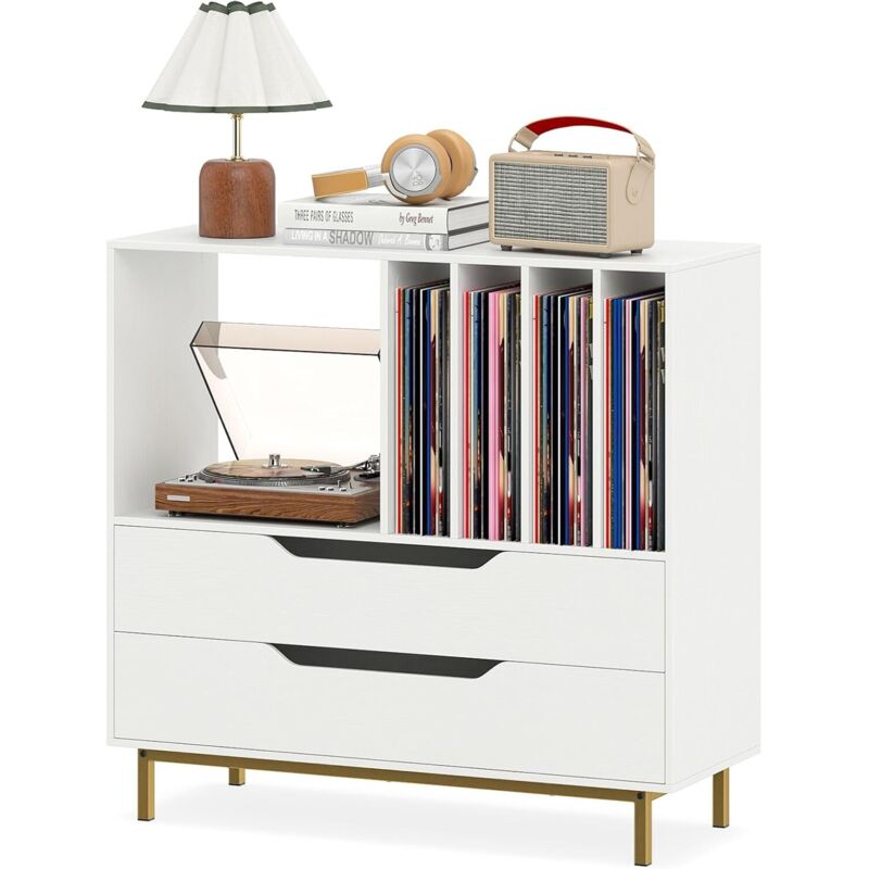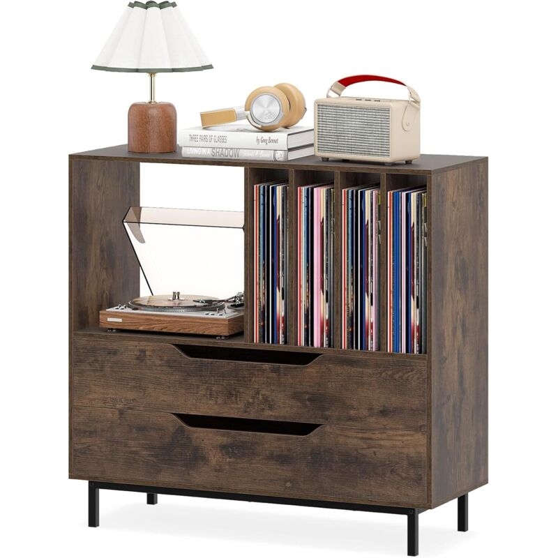 COSTWAY Meuble Vinyle avec 2 Tiroirs, Rangement Platine Vinyle 5 Compartiments, Support de Tourne-Disque pour CD/DVD, Grand Meuble HiFi pour Salon,