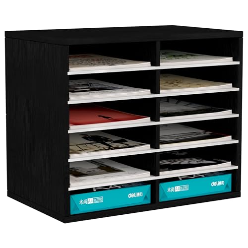EasyPAG 12 Compartiments Bois Corbeilles à Courrier A4 Banette de Rangement Bureau Porte Revue Organisateur de Magazine Range Document Bannette Papier,Noir