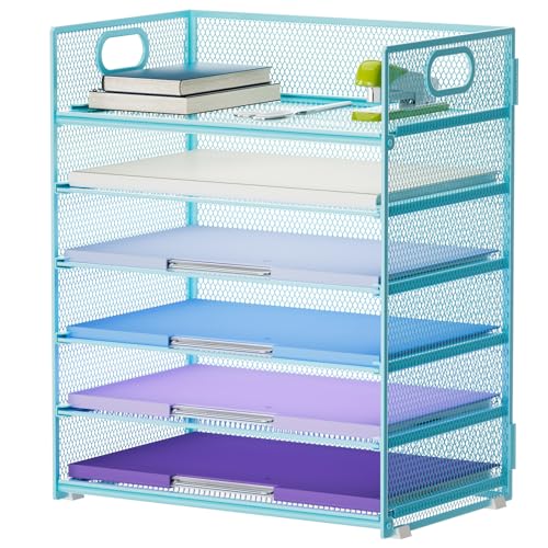 VITVITI 6 Niveaux Organisateur de Bureau Maille Métallique, Rangement de Papier avec Poignée, Banette de Rangement Bureau Corbeille a Courrier Range Document Bureau, Bleu