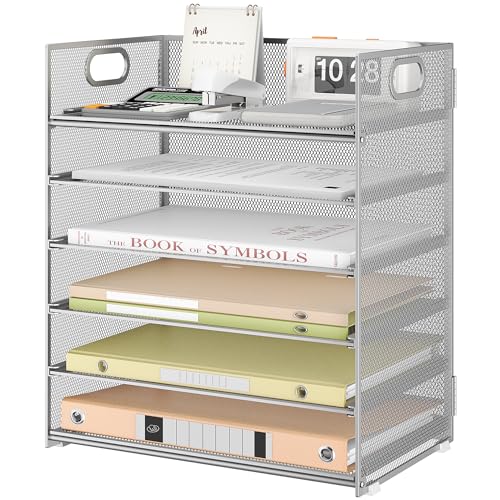 VITVITI 6 Niveaux Organisateur de Bureau Maille Métallique, Rangement de Papier avec Poignée, Banette de Rangement Bureau Corbeille a Courrier Range Document Bureau, Argent