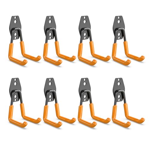 3-H Lot de 8 Crochet Mural Garage en Forme de U (Petit), Crochet de Garage à Double Crochets en Acier Résistant avec Revêtement Anti-Dérapant pour Rangement Outils de Jardin et Atelier,Orange