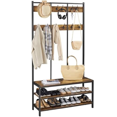 Yaheetech Grand Portemanteau, Meuble d'entrée avec 2 Étagères et Banc à Chaussures, 12 Crochets Double, Vestiaire avec Grand Espace de Rangement pour Salon Chambre Industrielle 100×40×185cm