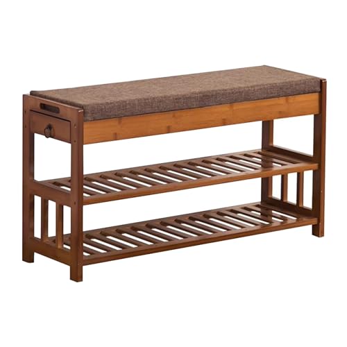 Banc de Rangement à Chaussures Rustique Marron avec Coussin en Coton et Lin, étagère à Chaussures en Bois avec tiroir latéral pour l'entrée, Solution de Rangement élégante pour Vos Chaussure