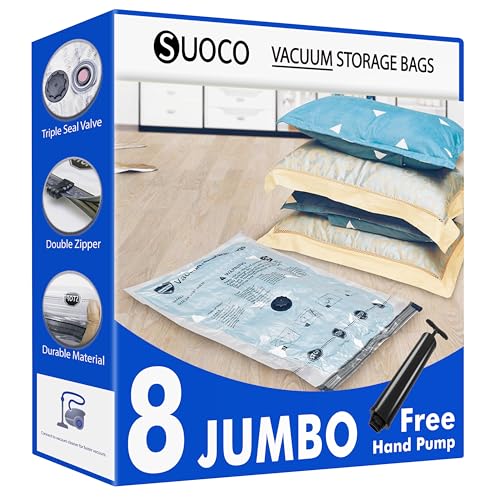 SUOCO Sacs de Rangement Sous Vide 8 Jumbo avec Pompe à Main de Voyage - Sacs de Compression Étanches Gain de Place pour Vêtements, Literie, Couettes, Grands Sacs Sous Vide pour Maison/Voyage