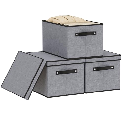 YheenLf Lot de 3 Bac de Rangement Tissus, Paniers et Boîtes avec Couvercle, 2 Poignée, Organisateurs pour Chambre à Coucher, Salon, Armoire, 42x30x26cm, Gris