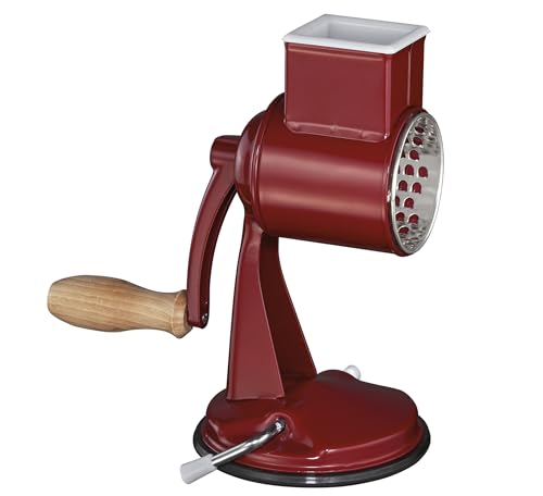 Zassenhaus Râpe à tambour classique manuelle, en métal laqué, bois de hêtre, acier inoxydable, pied à ventouse, 2 tambours à râper et pilon, utilisable comme coupe-légumes, râpe à fromage et rabot,