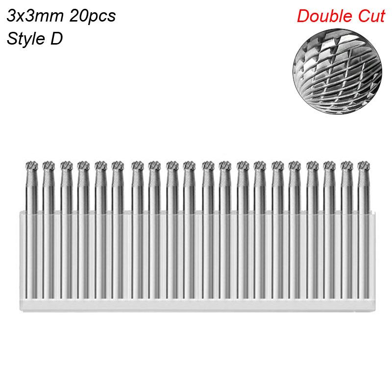 Double Burr D 20pc Fraise de travail en carbure de tungstène, tige de 3mm, 1/8 ", pour sculpture, râpe rotative, lime, diamant, acier, bois et métal ""Nipseyteko