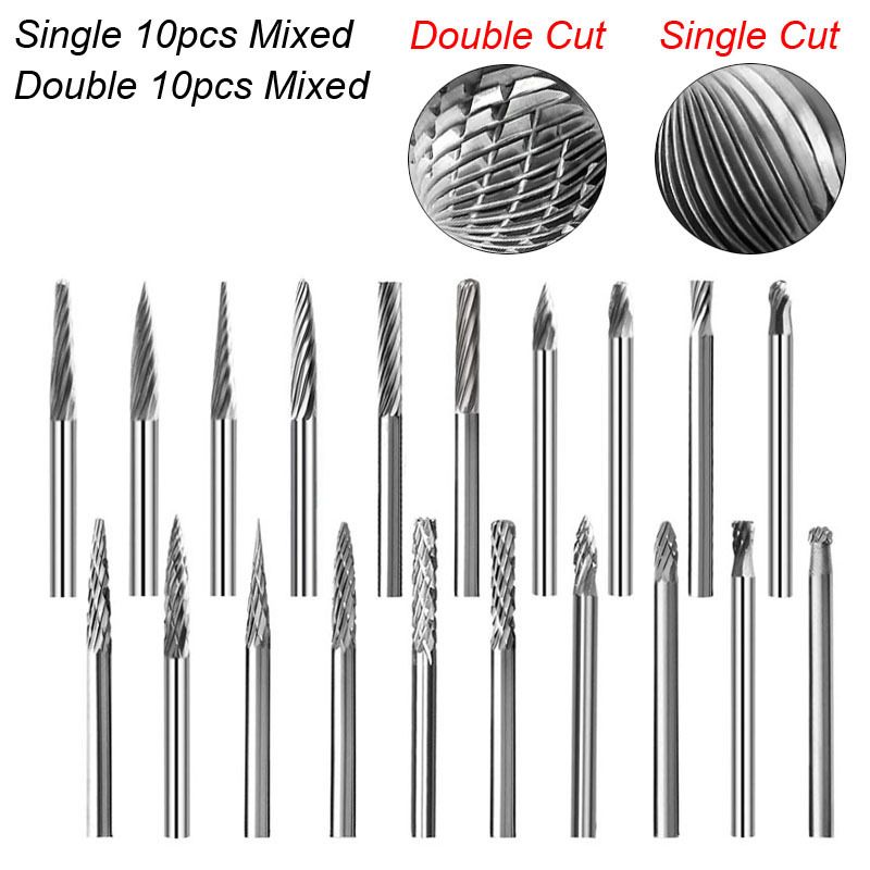 Double Burr F 20pc Fraise de travail en carbure de tungstène, tige de 3mm, 1/8 ", pour sculpture, râpe rotative, lime, diamant, acier, bois et métal ""Nipseyteko