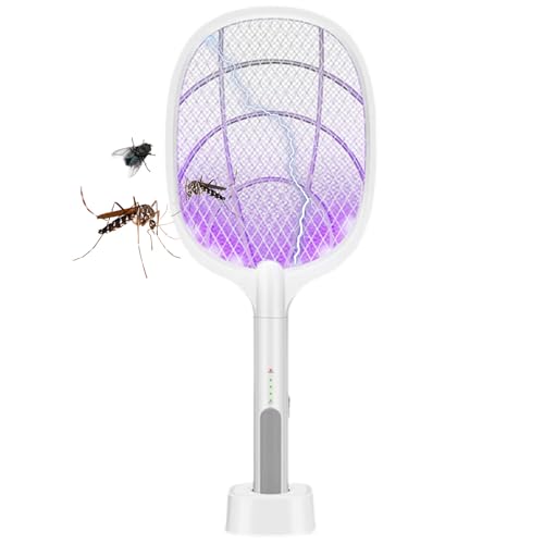 Raquette Anti-Moustiques Électrique, 3500V USB Rechargeable Tue Mouche Electrique avec Base de Chargement, Base de Montage Mural, Moustique lampe Lumière UV pour Moustiques Mouches Insectes Volants