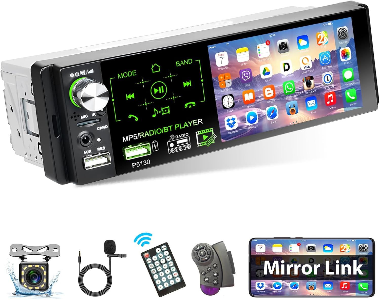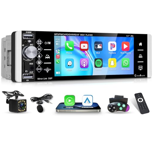 Hikity FM AM RDS 1 Din Autoradio Weireless Carplay Android Auto, Ecran Tactile 5,1 Pouces Bluetooth Poste Radio Voiture avec FM, EQ Mirror Link, AUX/TF/USB, Caméra de Recul