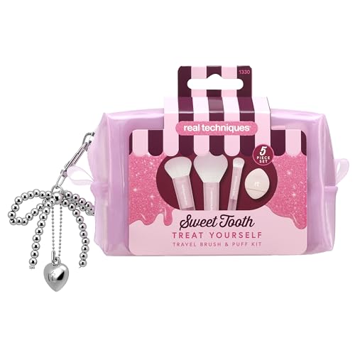 Real Techniques Sweet Tooth Treat Yourself Travel Brush & Puff 5 Piece Set, Mini Makeup Brush Set with Powder Puff, Travel Makeup Brushes for Foundation, Concealer, Blush & Powder, Cruelty-Free