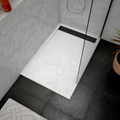 Receveur de douche L.120 x l.80 x H.4 cm, acrylique renforcé blanc effet pierre, avec grille d'évacuation noire, Galedo Pedra