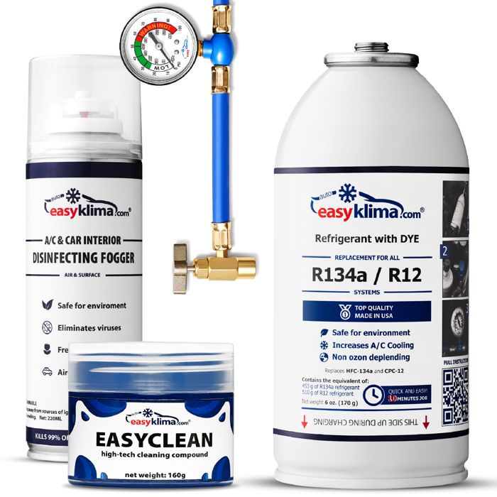 Kit de gaz R134a EasyKlima + désinfectant et caoutchouc de nettoyage pour voiture remplis toi-même ton système de climatisation