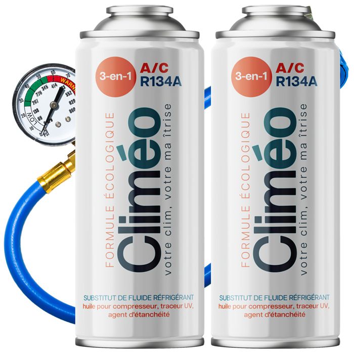 Kit Recharge Climatisation Voiture R134a/R12 - CLIMEO 3in1 - 2x235g - Gaz Réfrigérant - Bombe Recharge Clim Auto
