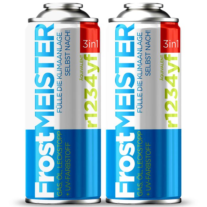Kit Recharge Climatisation Voiture R1234yf - FROSTMEISTER 3in1 - 2x235g - Gaz Réfrigérant - Bombe Recharge Clim Auto
