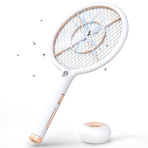 CONOPU Raquette Electrique Insectes, 4000V, Base de Recharge sans Fil USB, Rechargeable Raquette Anti Moustique, LED, Protection de Maille 3 Couches, Contre Les Insectes et Moustiques, Blanc