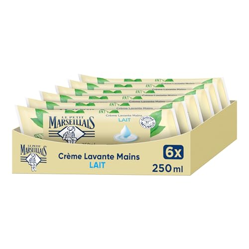 Le Petit Marseillais | Recharge Crème Lavante Mains Lait (lot de 6 berlingots de 250ml) – Recharge savon liquide avec 92% d'ingrédients d'origine naturelle – Savon mains au pH neutre pour la peau