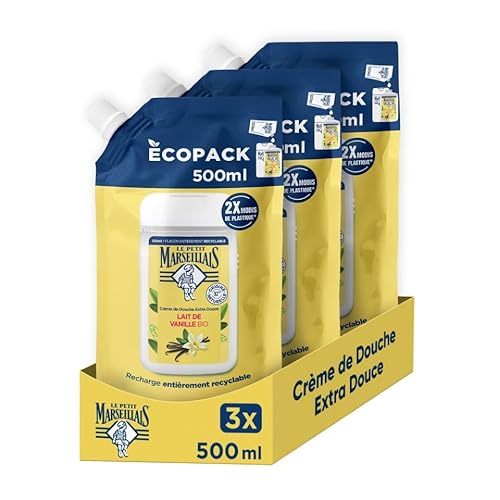 Le Petit Marseillais | Recharge Crème de Douche Extra Douce Lait de Vanille Bio (écopack de 500 ml) – 92% d'ingrédients d'origine naturelle – pH neutre pour la peau et sans colorant (Lot de 3)