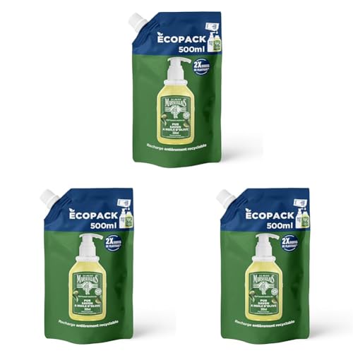 Le Petit Marseillais Recharge Gel Lavant Mains Pur Savon & Huile d'Olive (écopack de 500 ml) – Recharge savon liquide pour flacon-pompe – Savon mains enrichi en huile d'olive (Lot de 3)