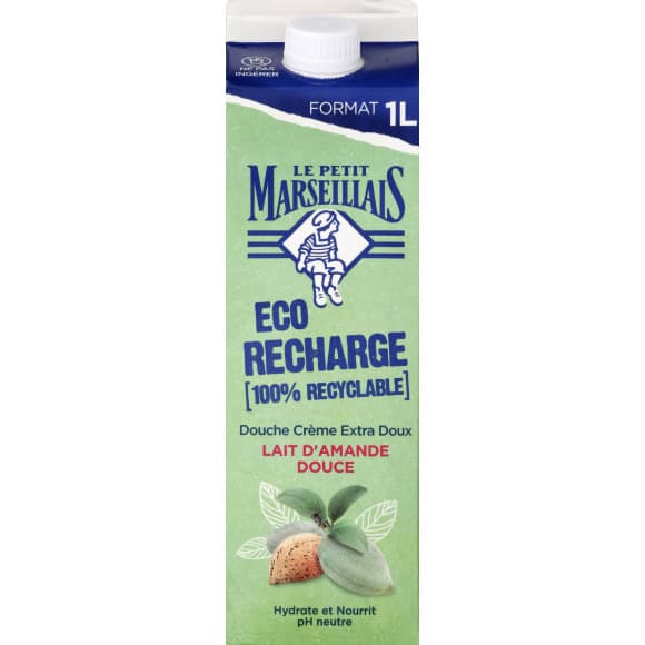 Le Petit Marseillais - Recharge Crème de Douche Extra Douce Amande Douce (brique de 1 L) – Recharge gel douche avec 92 % d'ingrédients d'origine naturelle – pH neutre pour la peau et sans colorant