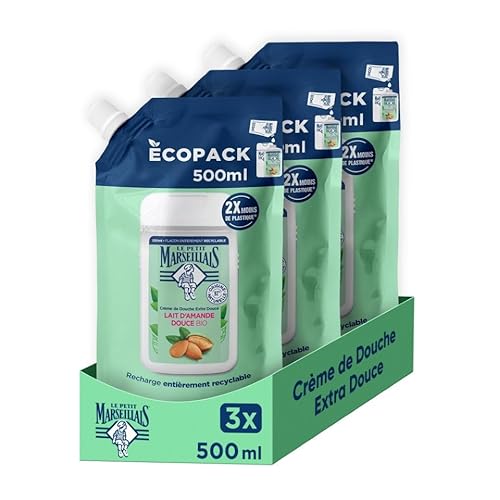 Le Petit Marseillais® | Recharge Extra Douce Crème de Douche Lait d'Amande Douce Bio (Écopack de 500ml) - Rechargez 2 fois votre Crème de Douche - 92% d'ingrédients d'origine naturelle. (Lot de 3)