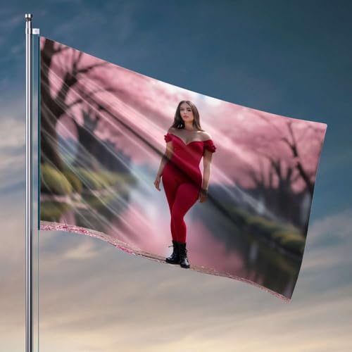 Drapeau pour dortoir amusant « A Woman In A Red Dress Standing By A Cherry Blossom-Lined Path. Flag For Guys Outdoor Fall Decor » (60 x 90 cm)