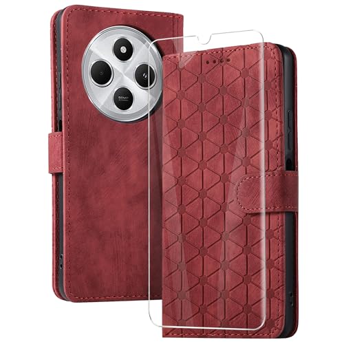 binandteam Coque pour Xiaomi Redmi 14C 4G / Redmi A4 5G avec Verre Trempé,Housse en Cuir PU Porte Carte Portefeuille, Etui de Protection à Rabat Magnétique,Pochette Fermeture Anti-Choc - Rouge