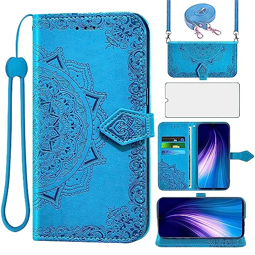 Asuwish Coque pour Xiaomi Redmi Note 8 Pro avec Verre Trempé Protecteur D'écran Rabat Support Cuir Porte Carte Portefeuille Mandala Étui Note8 8pro M1906G7G Housse Phone Cover Case Bleu