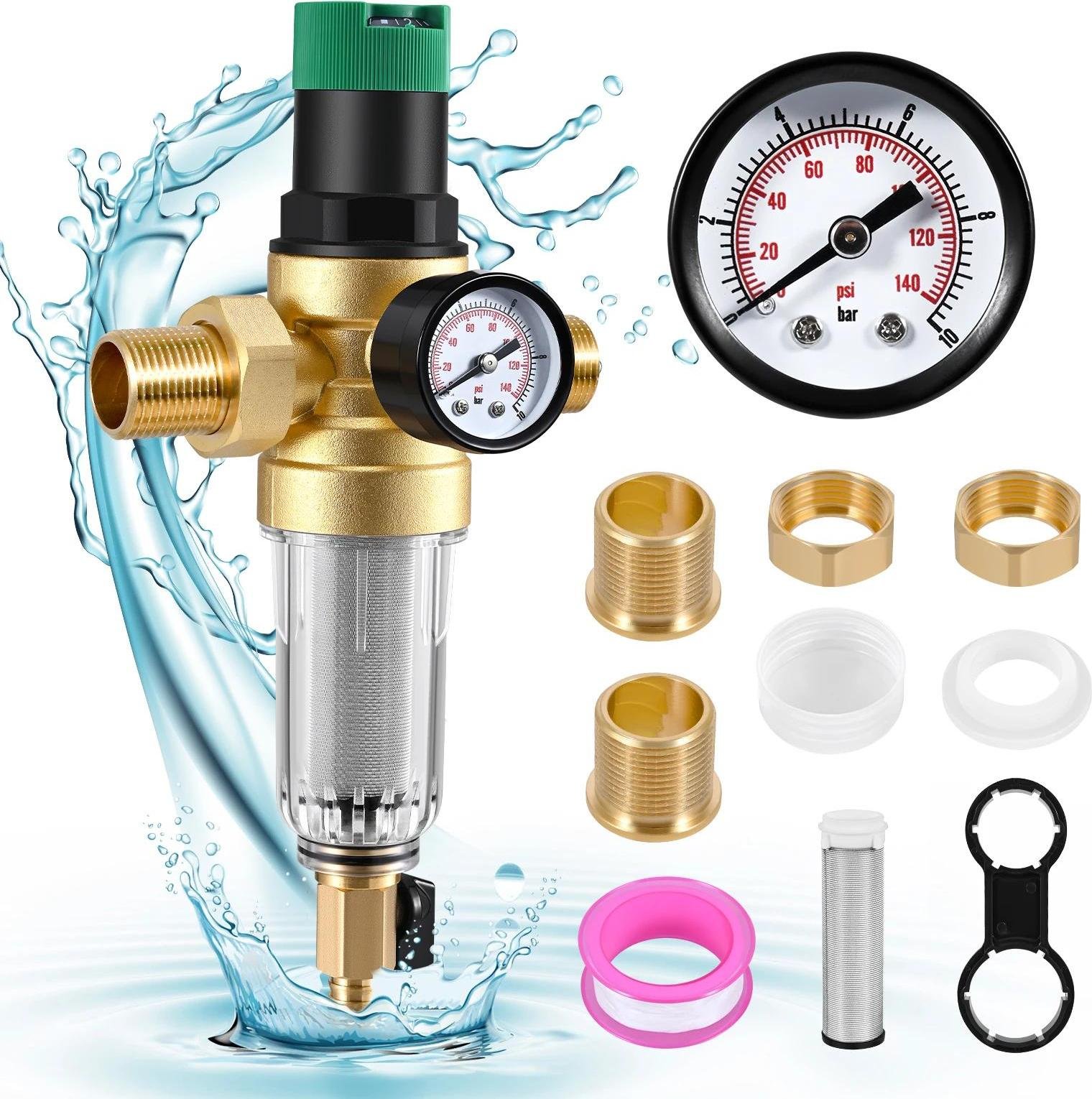 ZHEHNSA Filtre à contre-lavage 6pcs, Réducteur de pression d'eau 1'' Laiton avec Manomètre.