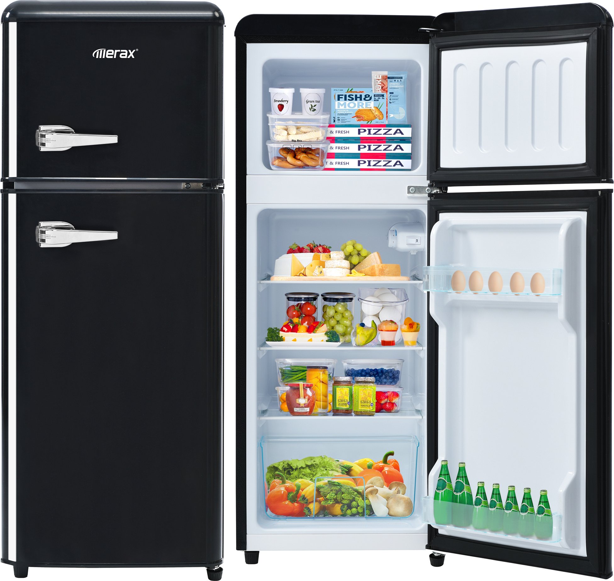 Réfrigérateur rétro Merax Réfrigérateur/congélateur BCD-102, Réfrigérateur vintage avec poignée de porte métallique, étagère et pieds réglables, double porte et éclairage LED, hauteur 101 cm, largeur 41 cm, 92 L, noir