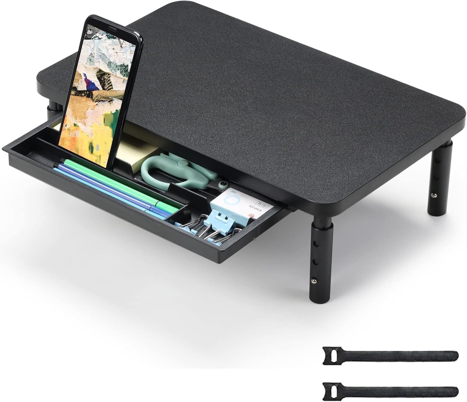 Support de Moniteur Réhausseur d¿Écran Support d'Ordinateur Lever PC Ecran, 3 niveaux de longueur et angle réglables avec support pour téléphone et tiroir, accessoires de bureau