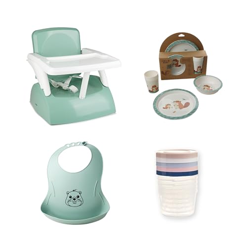 Rehausseur de chaise pour enfant + Boîtes de conservation + Coffret vaisselle micro-ondes + Bavoir semi-rigide