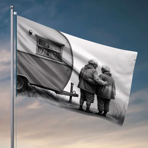 Drapeaux pour chambre de garçon, deux personnes âgées se tiennent ensemble près d'une remorque vintage. Drapeaux de jardin, décorations d'extérieur d'hiver pour terrasse (120 x 180 cm)