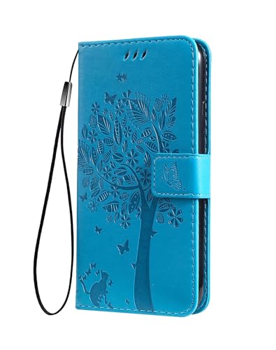 SEAHAI Coque pour Oppo Reno 13 Pro 5G (Reno13 Pro 5G) Etui Portefeuille, Joli Rétro Feuilles et Chat Embossée Premium PU Cuir Housse Flip Cover, Étui Antichoc Case, Bleu